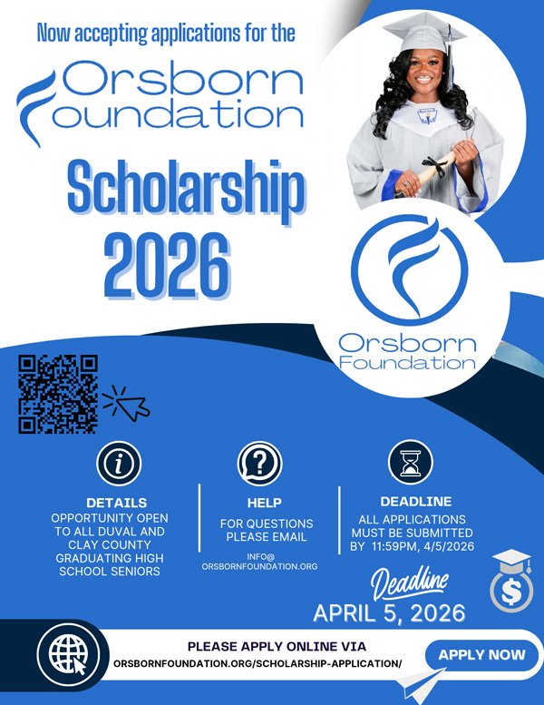 The Orsborn Foundation Scholarship 2026 is now accepting applications! This opportunity is open to graduating high school seniors in Duval and Clay County who are preparing to take the next step in their educational journey.